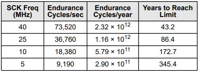 FeRAM存儲(chǔ)器具有讀取和還原機(jī)制。因此,對(duì)于存儲(chǔ)陣列的每次訪問(讀取或?qū)懭耄瑢葱惺┘幽途弥芷凇?FRAM體系結(jié)構(gòu)基于每個(gè)64位的16K行的行和列的陣列。整個(gè)行在內(nèi)部訪問一次,無論是讀取還是寫入一個(gè)字節(jié)或全部八個(gè)字節(jié)。在耐久性計(jì)算中,該行中的每個(gè)字節(jié)僅被計(jì)數(shù)一次。下圖顯示了一個(gè)64字節(jié)重復(fù)循環(huán)的耐久性計(jì)算,該循環(huán)包括一個(gè)操作碼,一個(gè)起始地址和一個(gè)順序的64字節(jié)數(shù)據(jù)流。這將導(dǎo)致每個(gè)字節(jié)在整個(gè)循環(huán)中經(jīng)歷一個(gè)持久周期。即使在40 MHz時(shí)鐘速率下,F(xiàn)RAM的讀寫持久性實(shí)際上也是無限的。