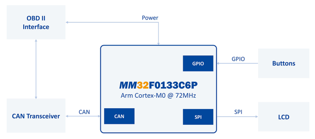 靈動(dòng)微MM32F0130微控制器的OBD診斷儀系統(tǒng)參考方案,以MM32F0133C6P為主控: