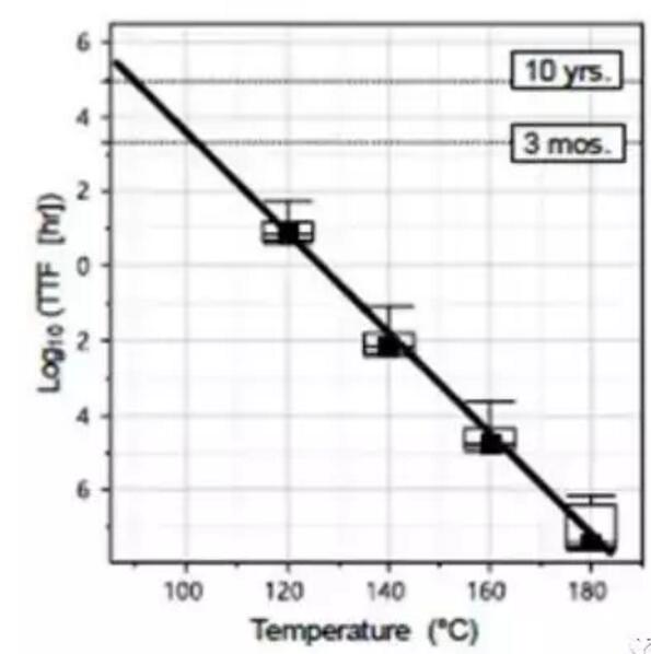 圖3.一組1Gb裸片的數據保留(DR)烘烤的失效時間與溫度的關系。實線擬合表示在85°C情況下為10年的DR,在100°C情況下為3個月的DR。