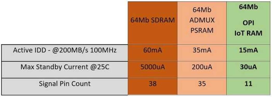 ram替換DRAM,消除了對外部刷新控制器的需求,這降低了接口的復雜性和相關的驗證成本,利用了外部SPI接口的使用,同時保持了最新IoT應用程序所要求的高性能水平,并降低整個系統的功耗。有些基于MCU的舊系統仍在使用SDRAM,在降低功耗和簡化接口方面,可以受益于IoT RAM的使用。下表清楚顯示了待機電流和有功電流的優點,同時保持了相當的傳輸速率。