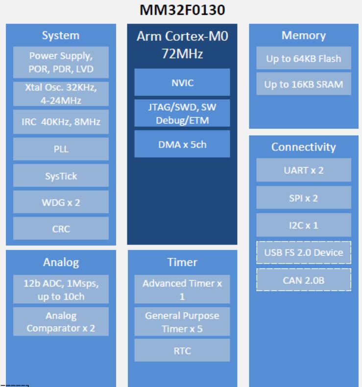 上海靈動(dòng)微電子通用MCU MM32F0130擁有M0內(nèi)核的高性能的32位微控制器,工作頻率可達(dá)72兆赫茲,并內(nèi)置高速flash存儲(chǔ)器,具有增強(qiáng)型I/O端口和外設(shè)連接到外部總線。其工作電壓為2.0V~5.5V,常規(guī)型環(huán)境工作溫度范圍-40?C∼85?C和擴(kuò)展型溫度范圍-40?C∼105?C。且多種省電工作模式保證低功耗應(yīng)用的要求。