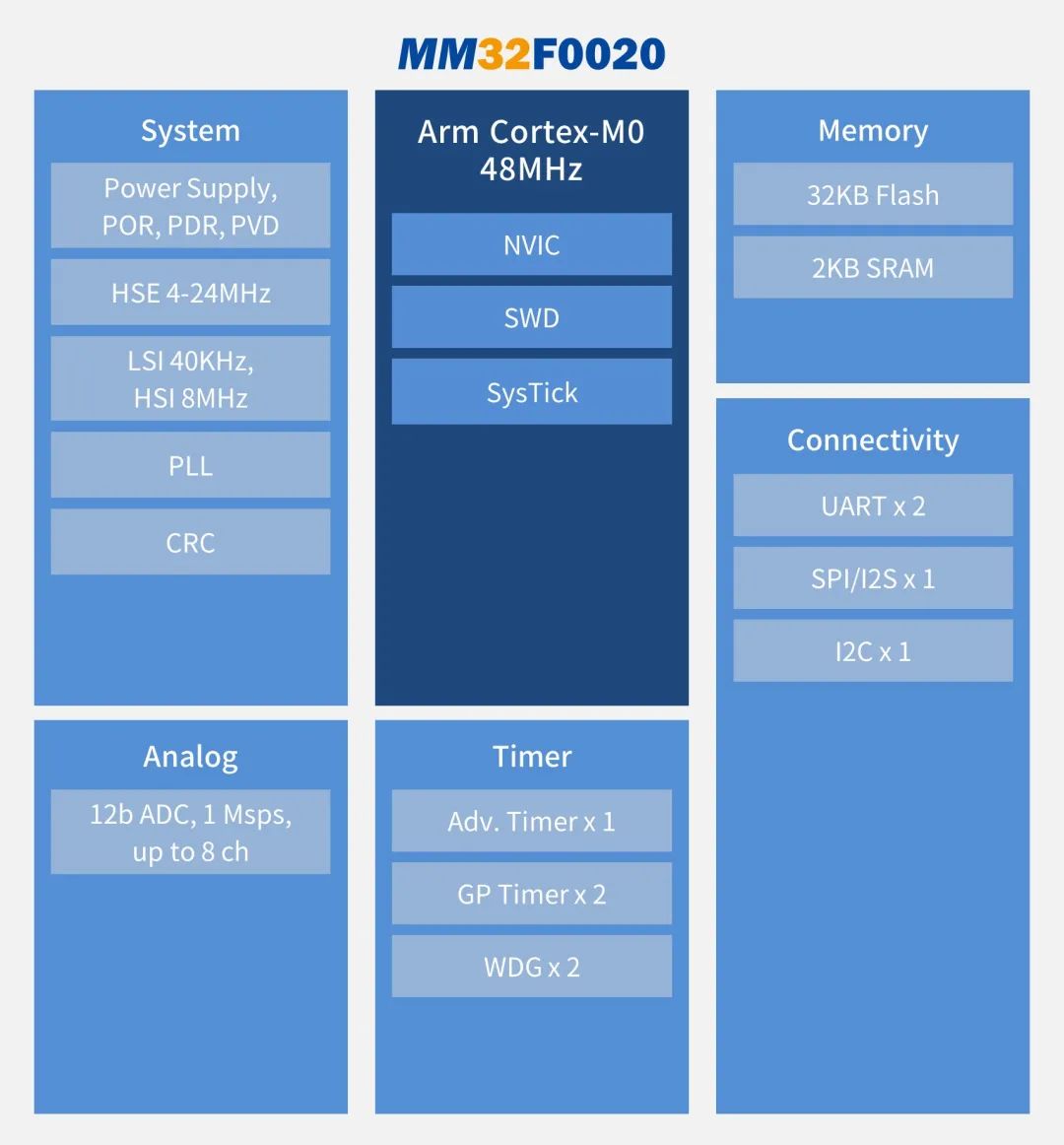 靈動(dòng)微MM32F0020B1T使用高性能的Arm®Cortex®-M0為內(nèi)核的32位MCU,搭載48兆赫茲,內(nèi)置32KB Flash和2KB SRAM的高速存儲(chǔ)器,具有豐富的增強(qiáng)型I/O端口和多種外設(shè)。包括1個(gè)12位的ADC,1個(gè)16位通用定時(shí)器、1個(gè)16位基本定時(shí)器、1個(gè)16位高級(jí)定時(shí)器,2個(gè)UART接口、1個(gè)SPI接口和1個(gè)I2C接口。