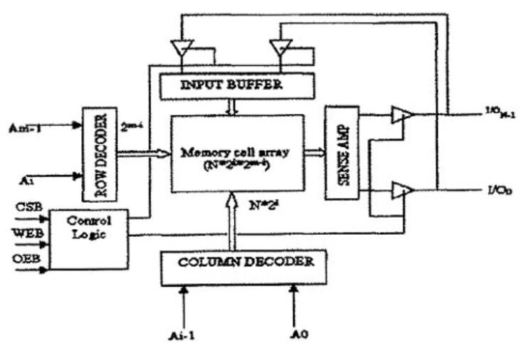 由上圖看出SRAM一般由五大部分組成,即存儲單元陣列、地址譯碼器(包括行譯碼器和列譯碼器)、靈敏放火器、控制電路和緩沖/驅(qū)動電路。在圖中A0-Am-1為地址輸入端,CSB. WEB和OEB為控制端,控制讀寫操作,為低電平有效1100-11ON-1為數(shù)據(jù)輸入輸出端。存儲陣列中的每個存儲單元都與其它單元在行和列上共享電學(xué)連接,其中水平方向的連線稱為“字線”,而垂直方向的數(shù)據(jù)流入和流出存儲單元的連線稱為“位線”。