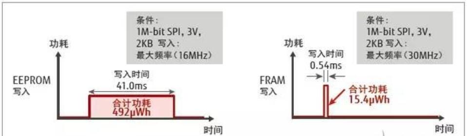 另外與同為非易失性存儲(chǔ)器的通用EEPROM相比,MB85RS1MT的寫(xiě)入時(shí)間較短,從而能夠大幅降低寫(xiě)入時(shí)的功耗。