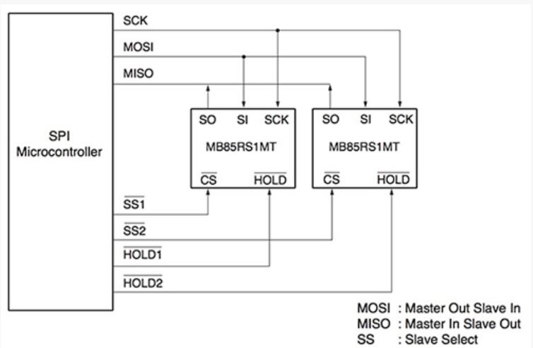 圖1:設(shè)備,如富士通MB85RS1MT允許使用熟悉的主/從配置為SPI-配備的MCU - 或使用使用設(shè)備的SI和SO端口,用于非基于SPI的設(shè)計,簡單的總線連接解決方案。 (富士通半導體提供)