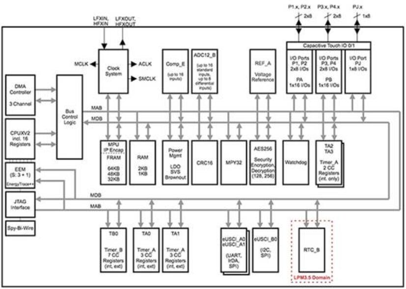 TI的MSP430FR5969是該公司低功耗MCU具有實質(zhì)性芯片F(xiàn)RAM存儲(圖2)。在主動模式下,