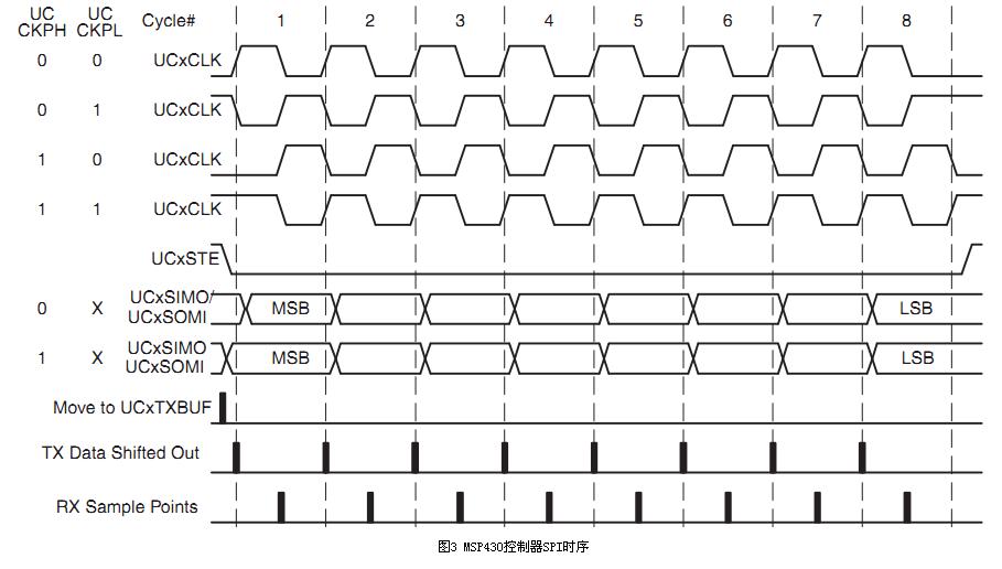 舉例來說,分別選取MSP430控制器和OLED驅動SH1101A為主從機,圖3和圖4為它們的SPI時序。由圖4可知,SH1101A的SPI時鐘空閑時為高電平,并且在后時鐘沿接收數據,則MSP430控制器SPI的設置應與此保持一致。從圖3中可以看出,要使得時鐘在空閑時為高電平,應將UCCKPL置1;要使得在后時鐘沿接收數據,應將UCCKPH清零。